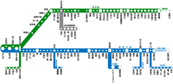 南海本線は南は「和歌山市」北は「なんば」駅に繋がっています。